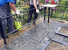 Первым делом мы подготовили участок к работам: демонтировали уже установленное надгробье, а также разровняли почву на могиле, тем самым подготовив её к укладке наземного покрытия.